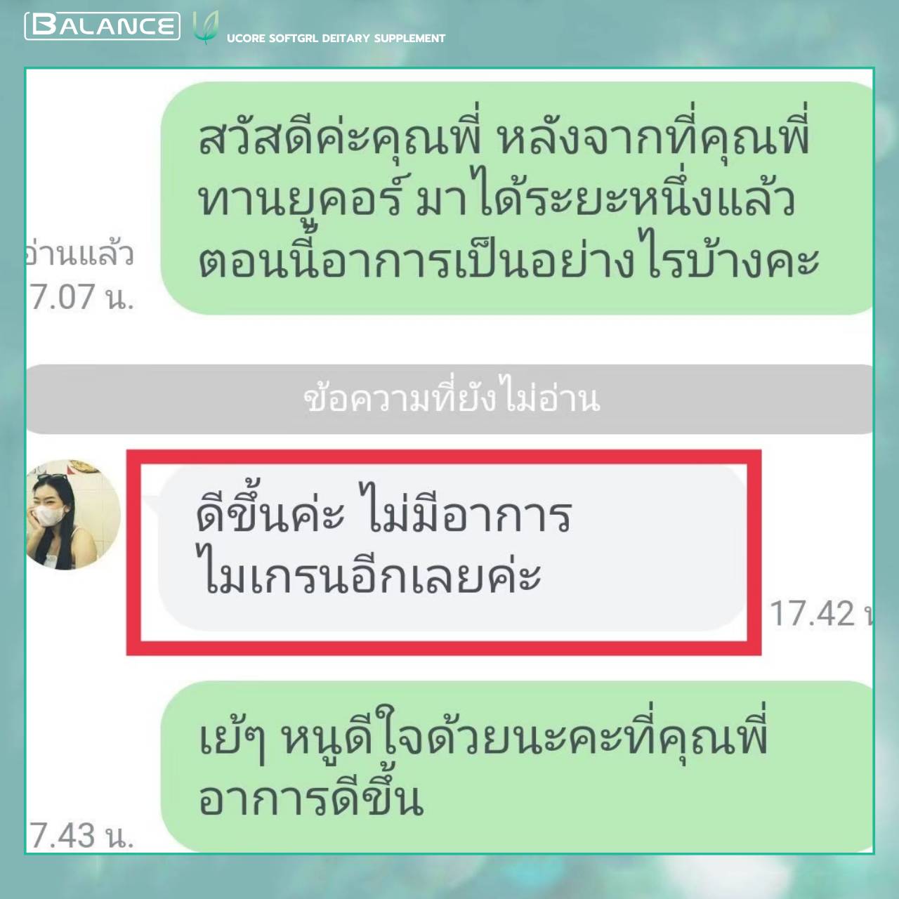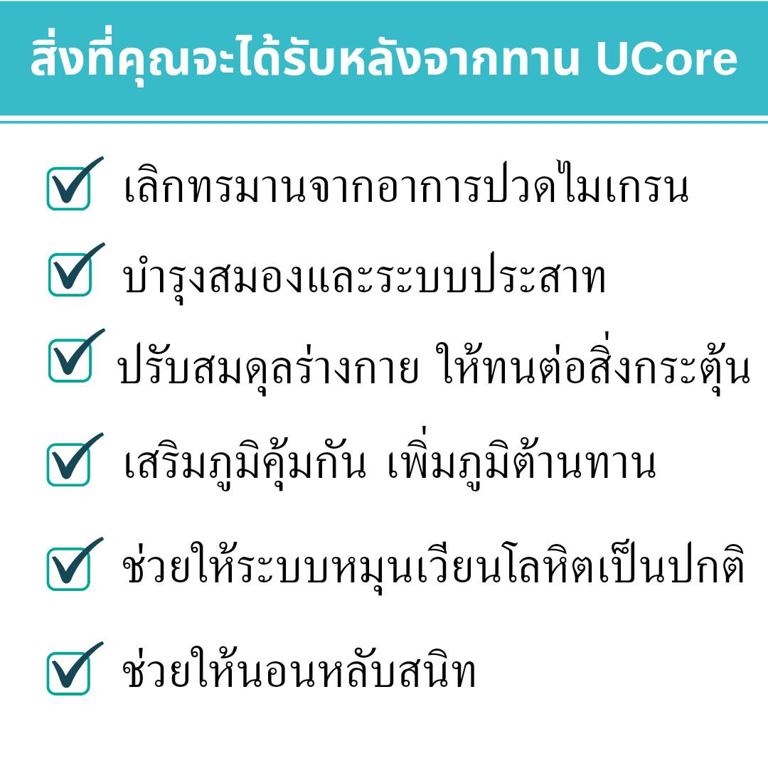 พอเจี๊ยบทาน UCore รู้สึกได้เลยว่าไม่มีอาการปวดหัวเลยค่ะ แต่เจี๊ยบก็ยังไม่มั่นใจ เจี๊ยบจึงตั้งใจทานต่อเนื่องจนหมดตามที่ผู้ขายแนะนำ ช่วงที่ทานยาอยู่นั้นรู้สึกได้ว่าหลับสนิท หลับลึก พอตื่นมารู้สึกสดชื่นมากเลยค่ะ