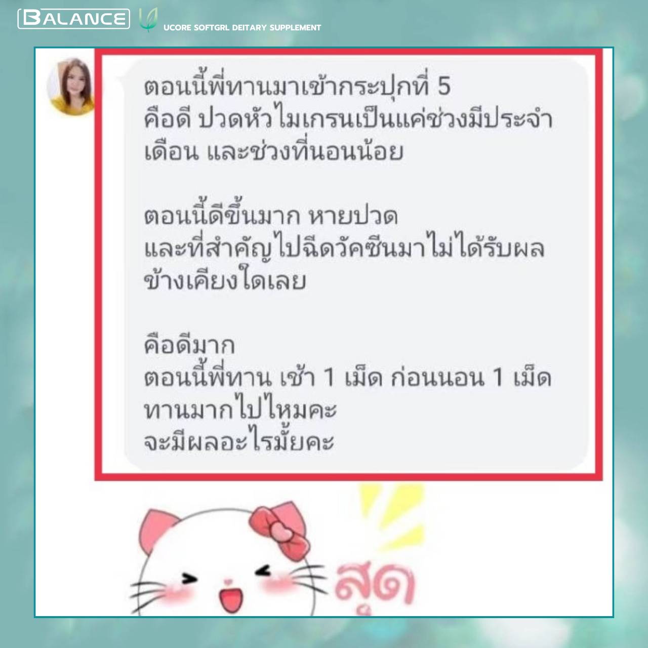 เจี๊ยบจึงคิดว่าไหนๆก็กินยามาเยอะแล้ว ลองอีกยี่ห้อนึงคงไม่มีอะไรเสียหาย  เจี๊ยบจึงตัดสินใจสั่งมาทานดู วันที่ได้รับ Balance u core นั้นเจี๊ยบกำลังปวดหัวอยู่ด้วยพอดี เจี๊ยบก็ทานยาแก้ปวดที่มีอยู่พร้อมทาน Balance u core 1 เม็ด ก่อนนอน
