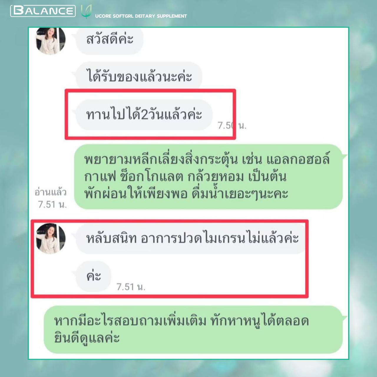 พอตื่นเช้ามารู้สึกโล่งสบายในหัวมากเลยค่ะ ก็แปลกใจนะค่ะว่าเป็นเพราะฤทธิ์ยาแก้ไมเกรน หรือว่าเพราะ Balance u core จากนั้นก่อนนอน เจี๊ยบทานได้ประมาณ  1 กระปุกสังเกตุได้ว่าอาการปวดหัวแทบไม่มีเลยค่ะ รู้สึกโล่งและสดชื่นขึ้นเรื่อยๆค่ะ